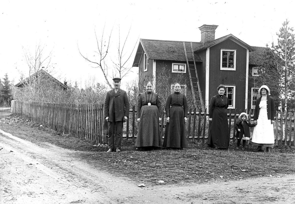 Från vänster Lars Ersson-Åslund f. 16 augusti 1838 d. 10 augusti 1913, okänd, hushållerska Margta Persdotter f. 14 januari 1869 d. 6 mars 1933, okänd, flickan Margit Åsberg-Karlsson f. 1 maj 1909, Margits faster Andrea Åsberg f. 10 januari 1884. Gården kallades Skolfars stuga.