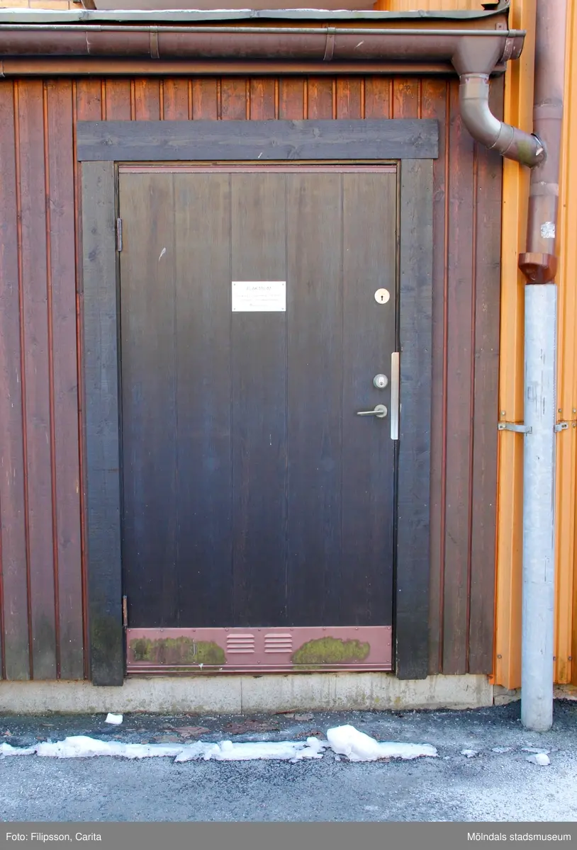 Ytterdörr till fläktrum tillhörande något av husen Bergmansgatan 4, 6, 8 och 10 i Mölndals Centrum. Fotografi taget den 26 februari 2018. Byggnadsdokumentation inför rivning.