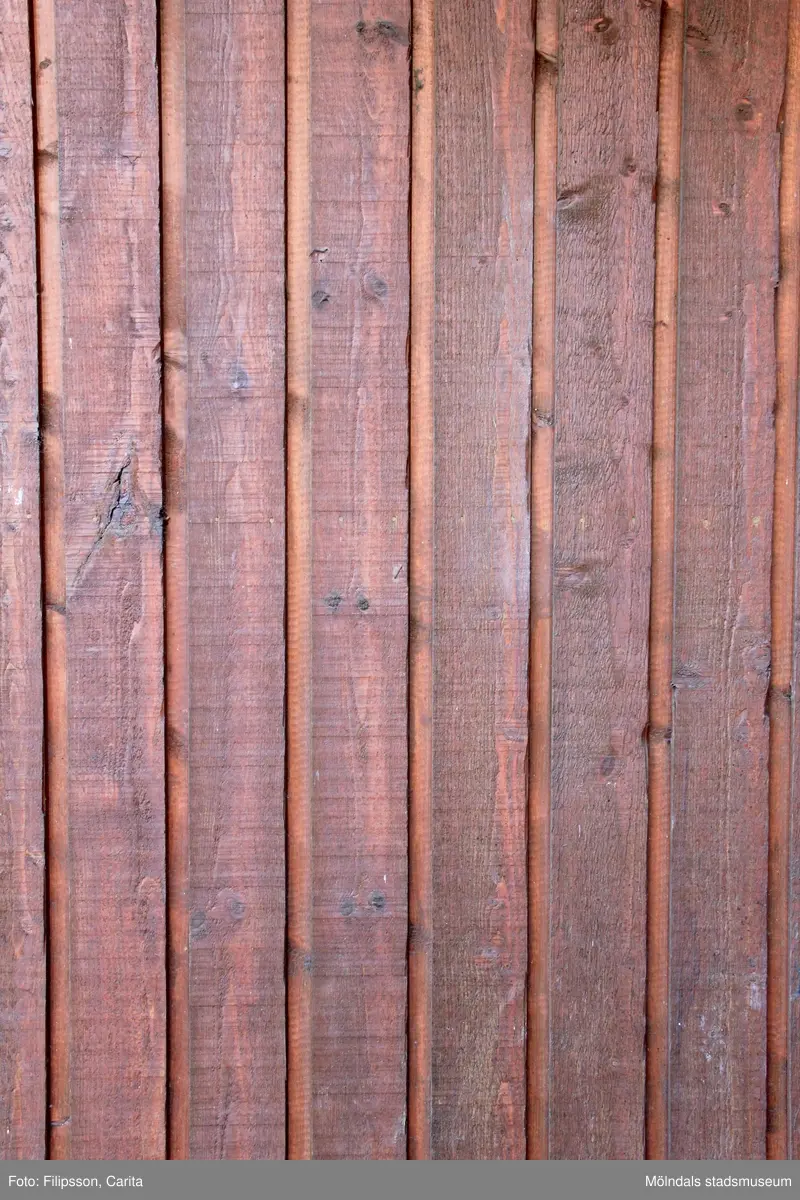 Del av fasaden i brunt trä. Byggnadsdetalj från något av husen med adresserna Bergmansgatan 4, 6, 8 och 10 i Mölndals Centrum. Fotografi taget den 27 februari 2018. Byggnadsdokumentation inför rivning.