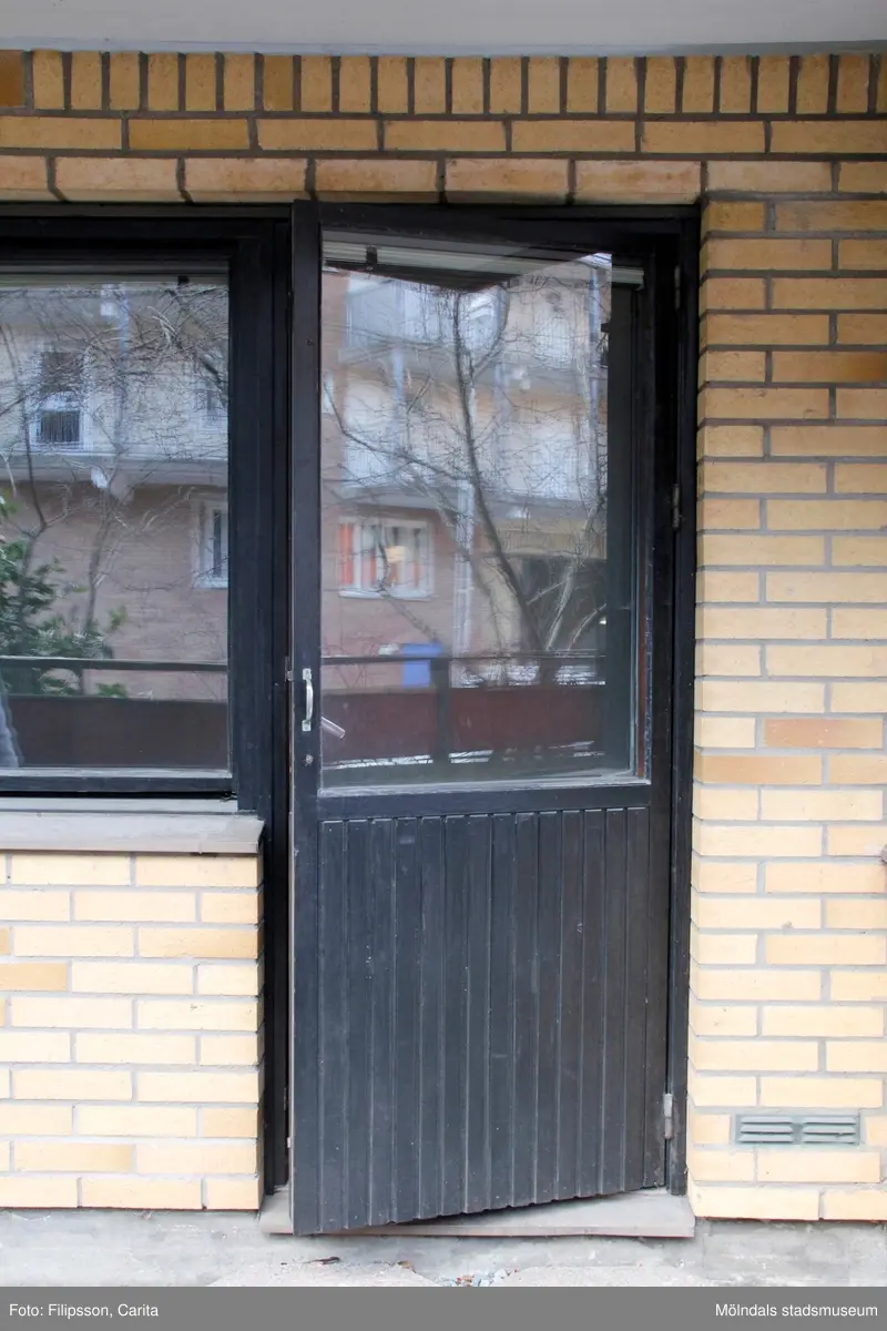 Altandörr. Byggnadsdetalj från något av husen med adresserna Bergmansgatan 4, 6, 8 och 10 i Mölndals Centrum. Fotografi taget den 27 februari 2018. Byggnadsdokumentation inför rivning.