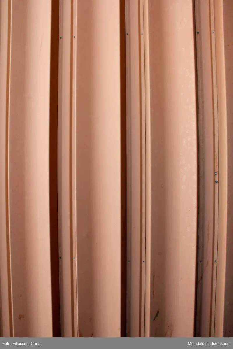 Del av fasaden i plåt. Byggnadsdetalj från något av husen med adresserna Bergmansgatan 4, 6, 8 och 10 i Mölndals Centrum. Fotografi taget den 26 februari 2018. Byggnadsdokumentation inför rivning.