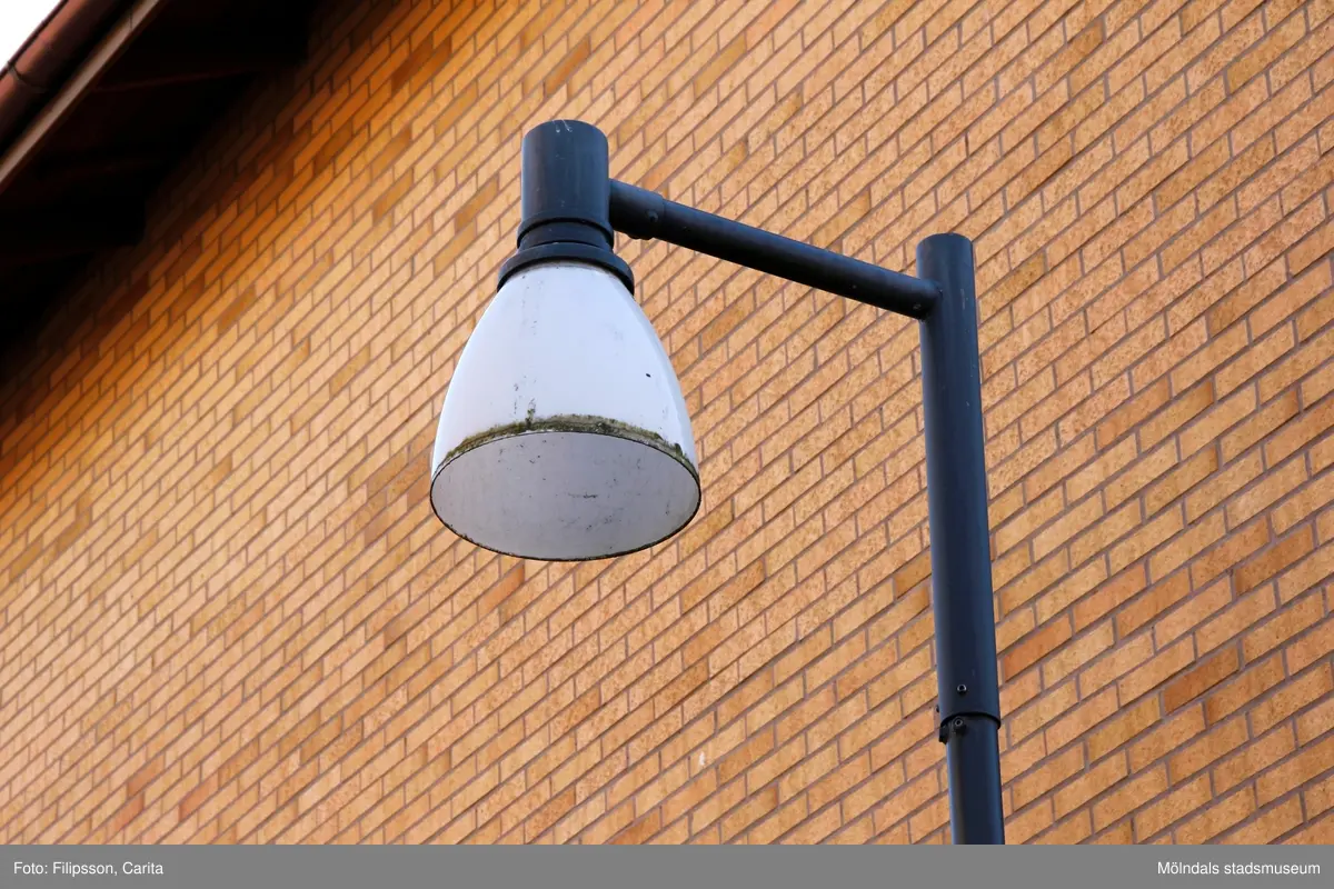 Hög gårdslampa mot husfasaden. Gårdssidan av husen som har adresserna Bergmansgatan 4, 6, 8 och 10 i Mölndals Centrum. Fotografi taget den 26 februari 2018. Byggnadsdokumentation inför rivning.