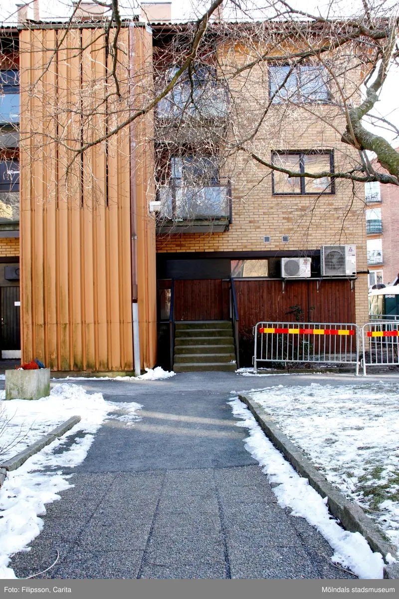 Gångbana, husfasad och trapphus på gårdssidan av något av husen med adresserna Bergmansgatan 4, 6, 8 och 10 i Mölndals Centrum. Fotografi taget den 26 februari 2018. Byggnadsdokumentation inför rivning.