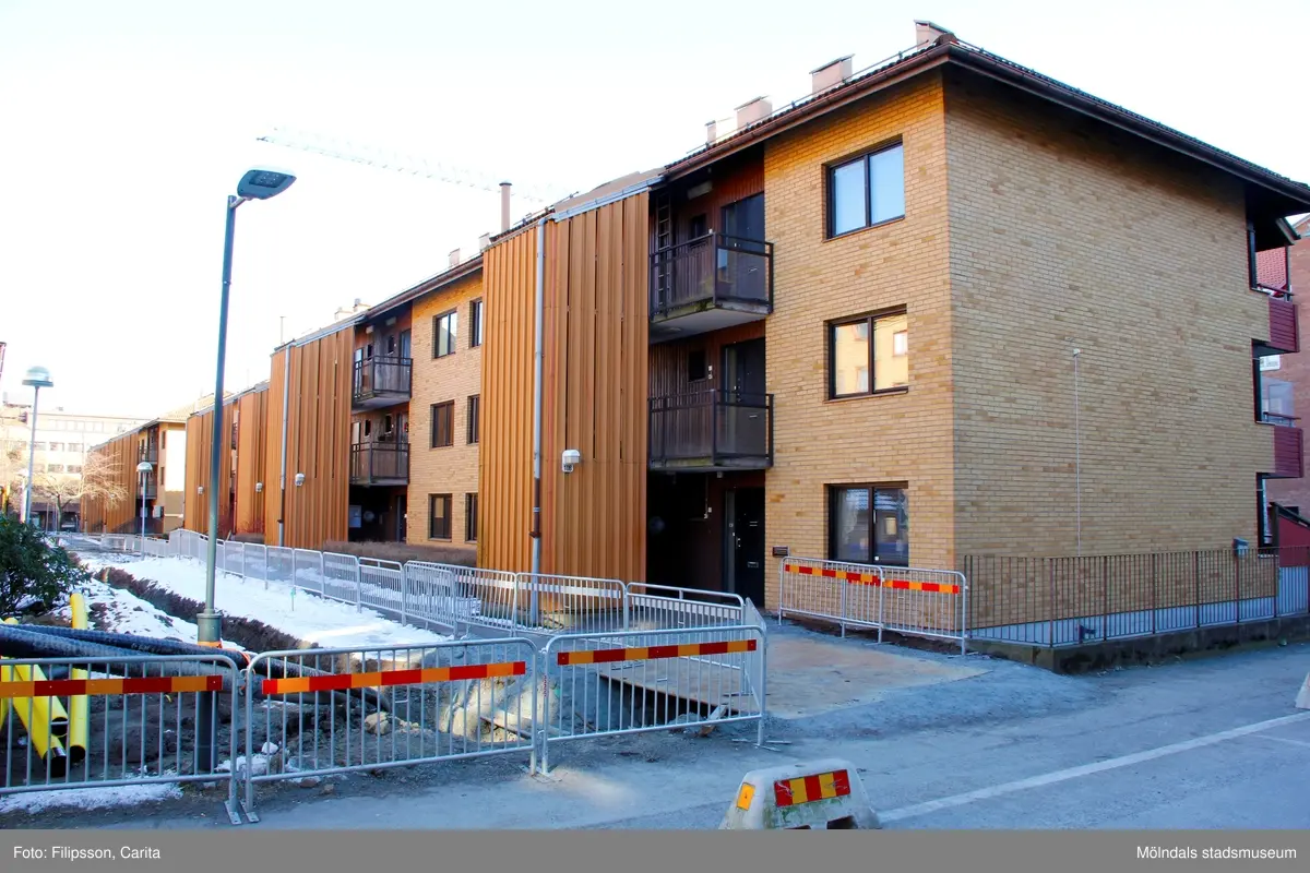 Vy från Medborgaregatan mot bostadsbebyggelse vid Bergmansgatan i Mölndals Centrum. Närmast ses nordvästra fasaden av huset Bergmansgatan 10. Fotografi taget den 26 februari 2018. Byggnadsdokumentation inför rivning.