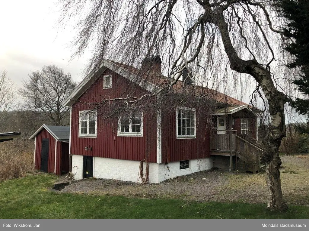 Rödmålat bostadshus i trä med adress Streteredsvägen 8 i Våmmedal, Kållered, i Mölndals kommun. Fastighetesbeteckning är Våmmedal 2:65. Fotografi taget i mars 2020. Byggnadsdokumentation inför rivning.
