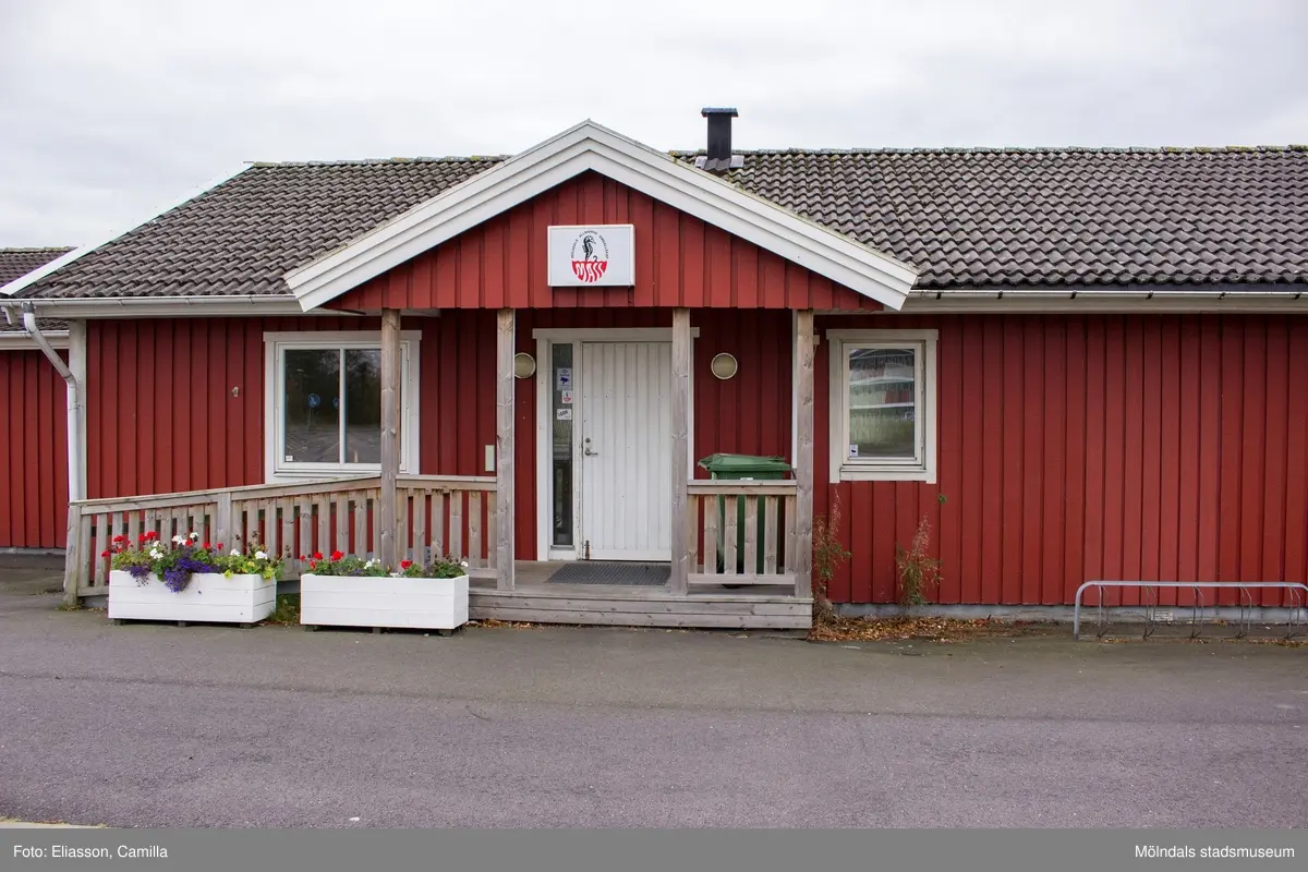 Mölndals Allmänna Simsällskaps (MASS) klubbhus med adress Idrottsvägen 15 i Åby, Mölndal, den 11 oktober 2016. Fasaden vetter mot norr.