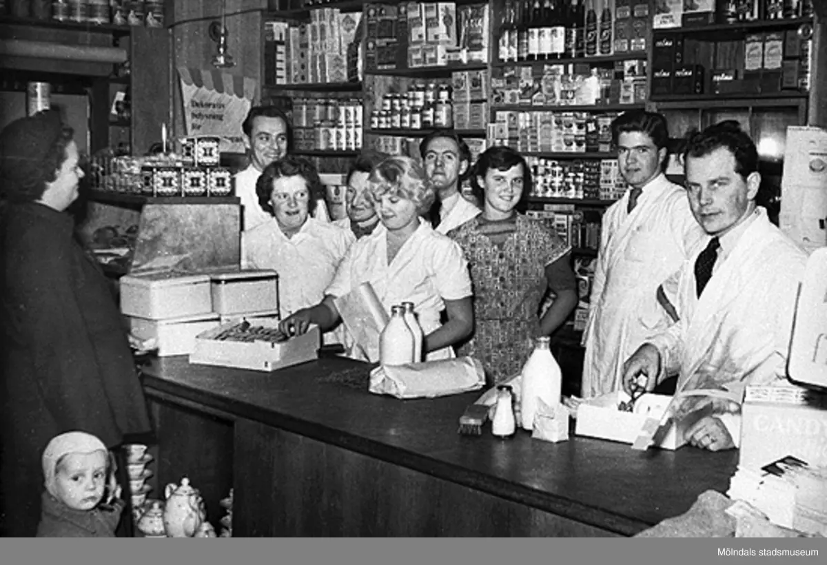 Personalen i Lindgrens Lanthandel, specerier och manufaktur, 1938-1940. Affären låg på Gamla Riksvägen 42 i Kållered.