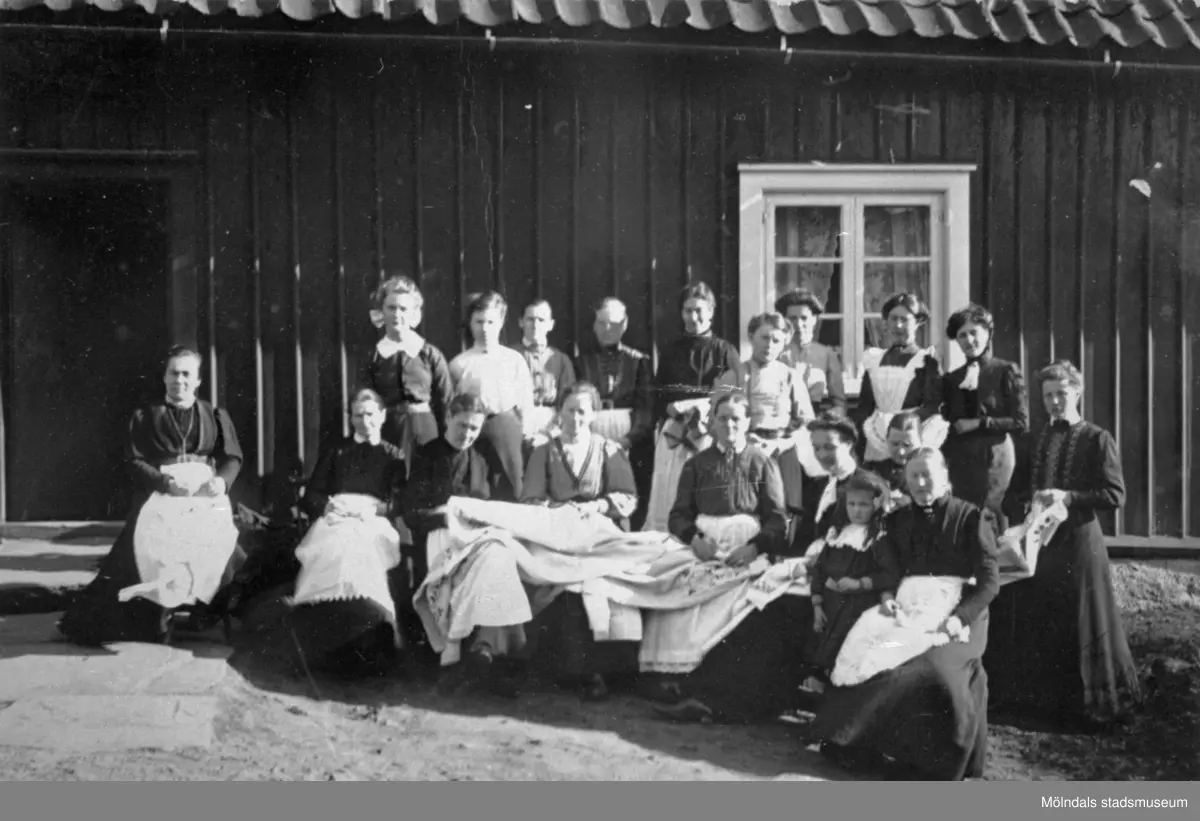 Vykortsupplaga av symöte med missionen (Kållereds missionsförsamling) vid Olas stuga, 1900-tal. I främre raden längst till höger sitter Maria Eriksson (moster till Valdeborg Johansson). Till vänster om henne (fosterbarnet och flickan) Märta Persson. Text på fotots baksida: Symöte m. missionen. Ur Valdeborg Johanssons fotoalbum.