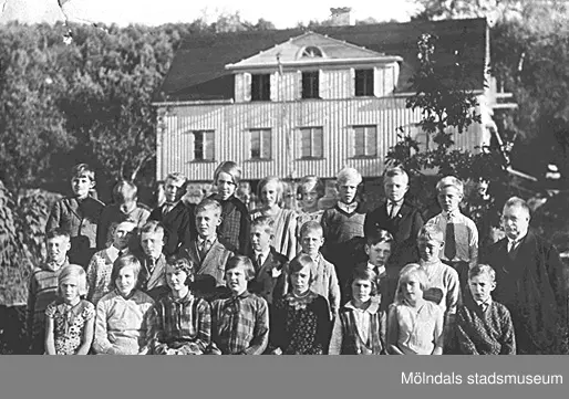 Skolbarn från Gamla Liveredsskolan (födda 1918-1919) står utomhus i Kållered. Ingrid Larssons (albumets ägare) bror Bengt (från Bölet) finns med i bild. Skolläraren är Birger Ahlström (1875 - 1950). I bakgrunden ses Gamla Liveredskolans lärarbostad som ligger vid nuvarande Streteredsvägen 59. Byggd i början av 1930-talet. Till vänster bodde folkskollärare Ahlstrand i två våningar, till höger bodde småskollärare Greta Hernqvist i en lägenhet och ovanför henne bodde folkskollärare Jessie Thölén i en större lägenhet.