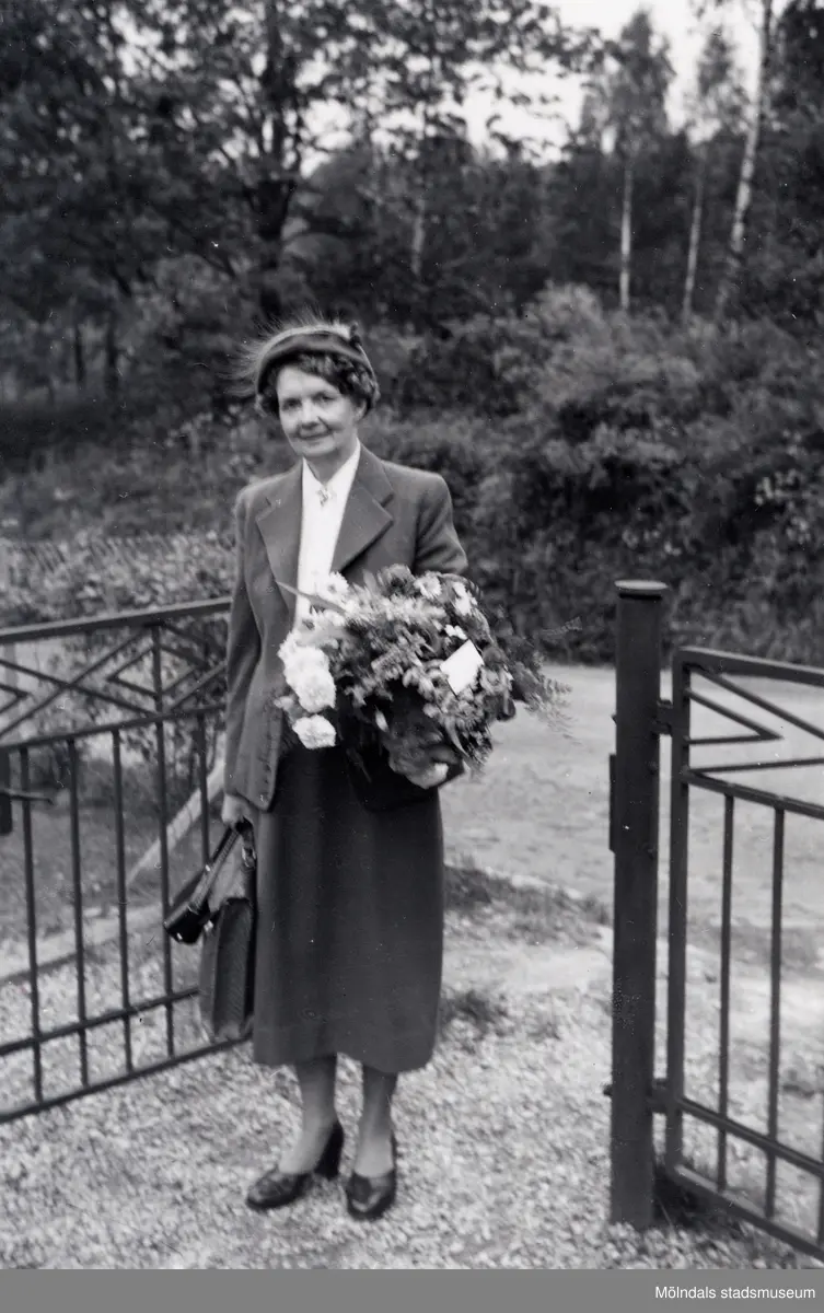 Lärarinnan Agda Carlson med blommor i handen ståendes vid grinden till huset Rådavägen 10 i Sjövalla, Mölndal. Skolavslutning, ca 1950?