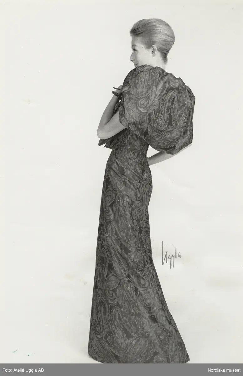 Mannekäng i mönstrad blå taftklänning. NK:s Franska damskrädderi efter Givenchy.