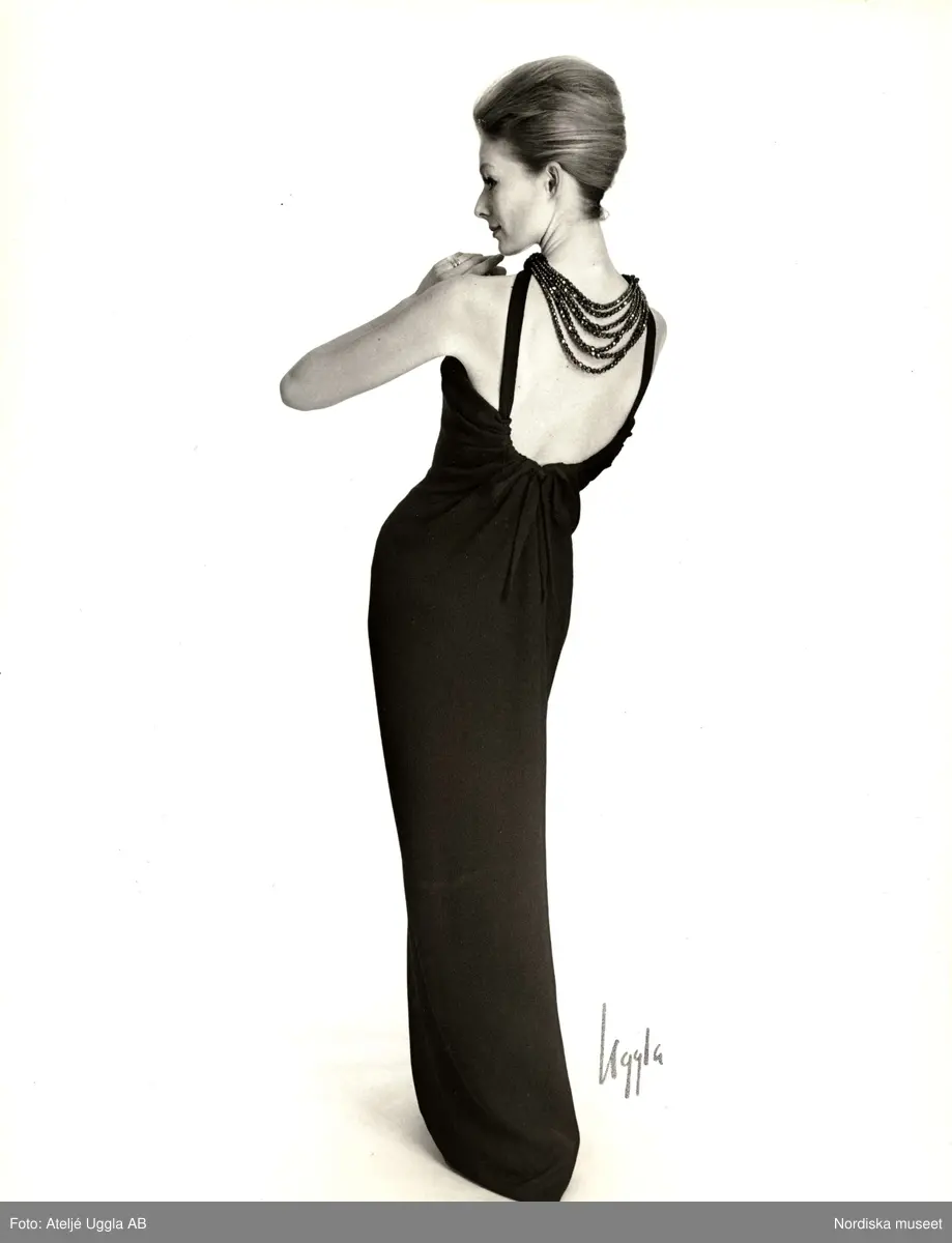 Modell i svart aftonklänning. Svart, flerradigt pärlhalsband."Nordiska Kompaniet, NK:s Franska damskrädderi, original Lanvin. Aftonklänning i svart cloqué". Modellens frisyr så kallad svinrygg.