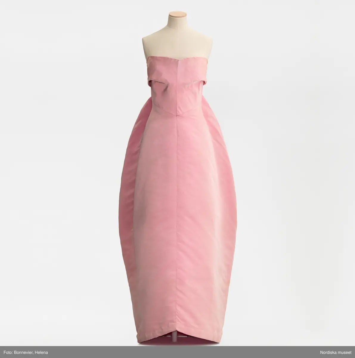 Klänning monterad på docka. Originalmodell från Cristóbal Balenciaga i rosa sidenfaille som visades på NK:s Franska damskrädderi. Karin Ellhammar (född 1938) erbjöds att köpa originalet i slutet av säsongen, hösten 1960. I Röhsska museets samlingar, RKM 40-1999.