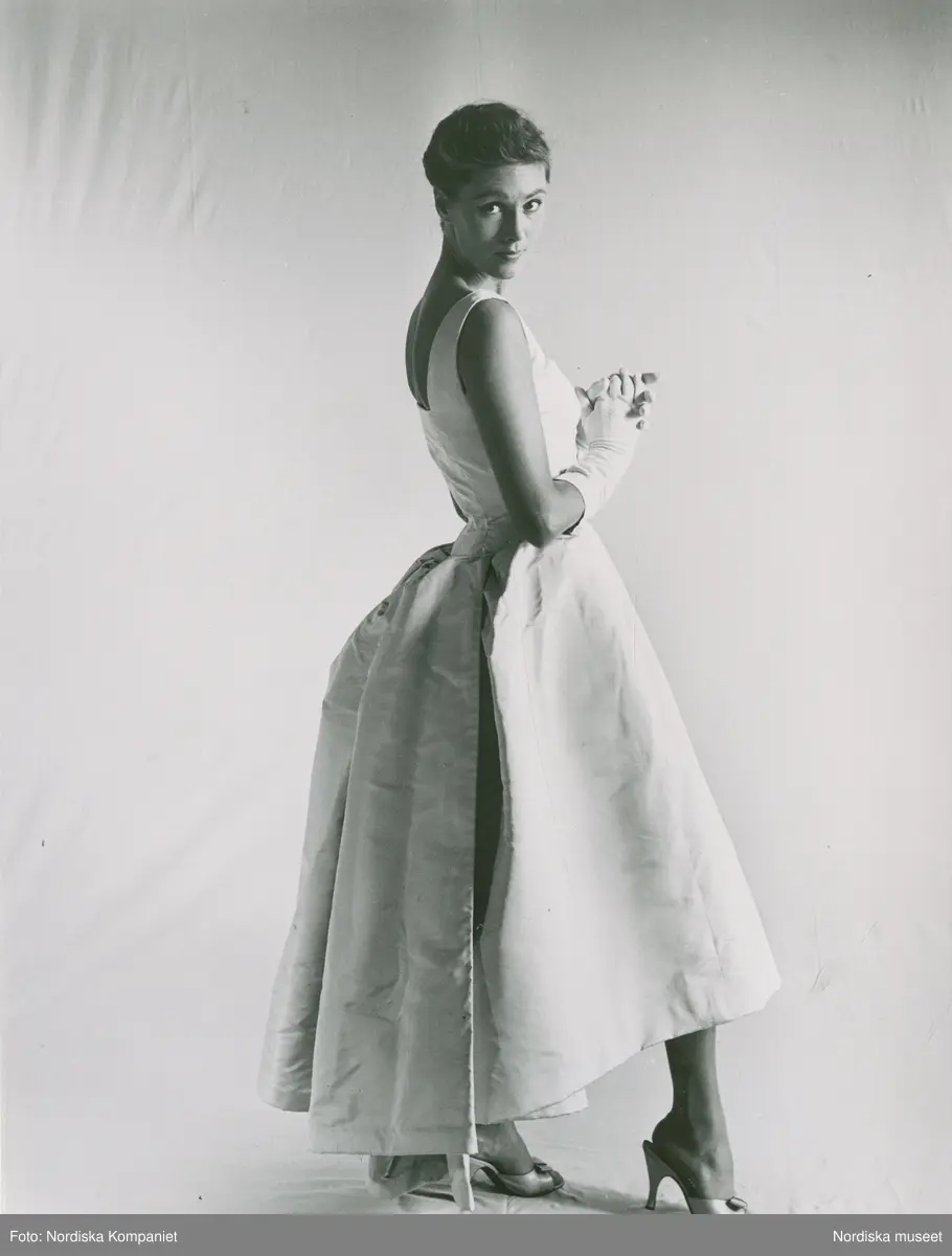 Mannekäng i aftonklänning, handskar och högklackade skor. NK:s Franska damskrädderi.