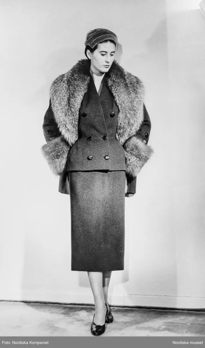 Mannekäng visar höstplagg i provrummet vid NK:s Franska damskrädderi. Dräkt av ylletyg med stusslång, figursydd jacka, dubbelknäppt utan krage. Vadlång rak kjol. Över bär hon en längre jacka med pälskrage och pälskantad ärm. Hatt med flor och pumps. Från Jean Patou.