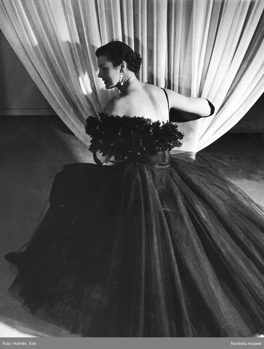 Modell i balklänning i svart tyll på svart faille vid ljust draperi. Av Maggy Rouff. NK:s Franska damskrädderi