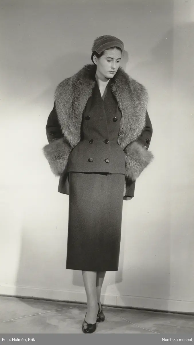 Modell i dräkt, hatt och pälsboa. Från Jean Patou. NK:s Franska damskrädderi.