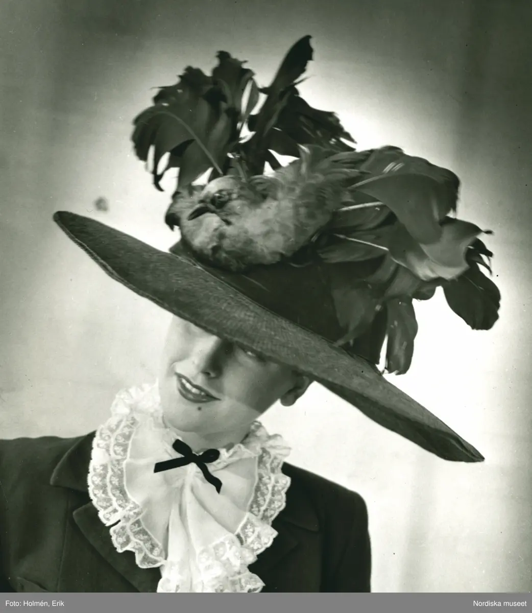 Porträtt av kvinna i bredbrättad hatt med fjädrar och fågeldekoration (NM.0213374), av Suzanne Pellin, samt vit spetskrage och mörk kavaj.