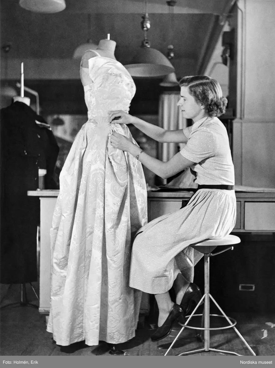 Uppsätterska sitter på arbetsstol i NK:s Franska damskrädderis sömnadsateljé och provar ut ett plagg, en balklänning som monterats på docka. I bakgrunden arbetsbord. Se klänningen även NMA.0099883.