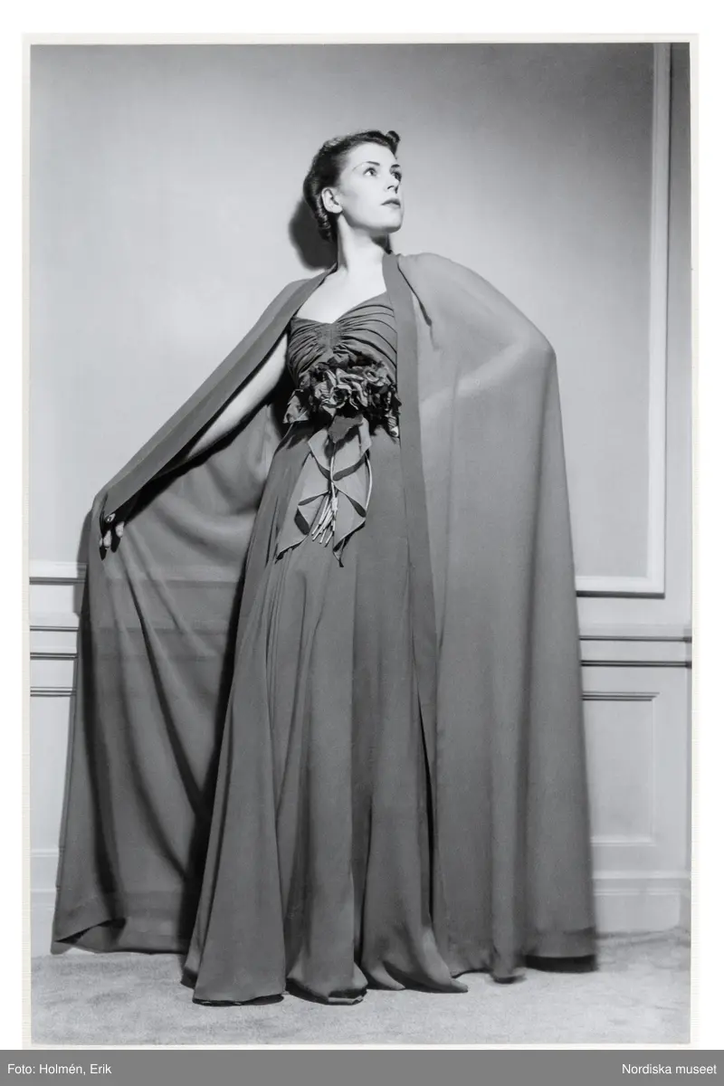 Mannekäng visar festklänning. Klänning med rynkning vid bysten samt corsage, hellång, vid kjol. Över axlarna en fotsid cape av transparent tyg. NK:s Franska damskrädderi, från Edward Molyneux.