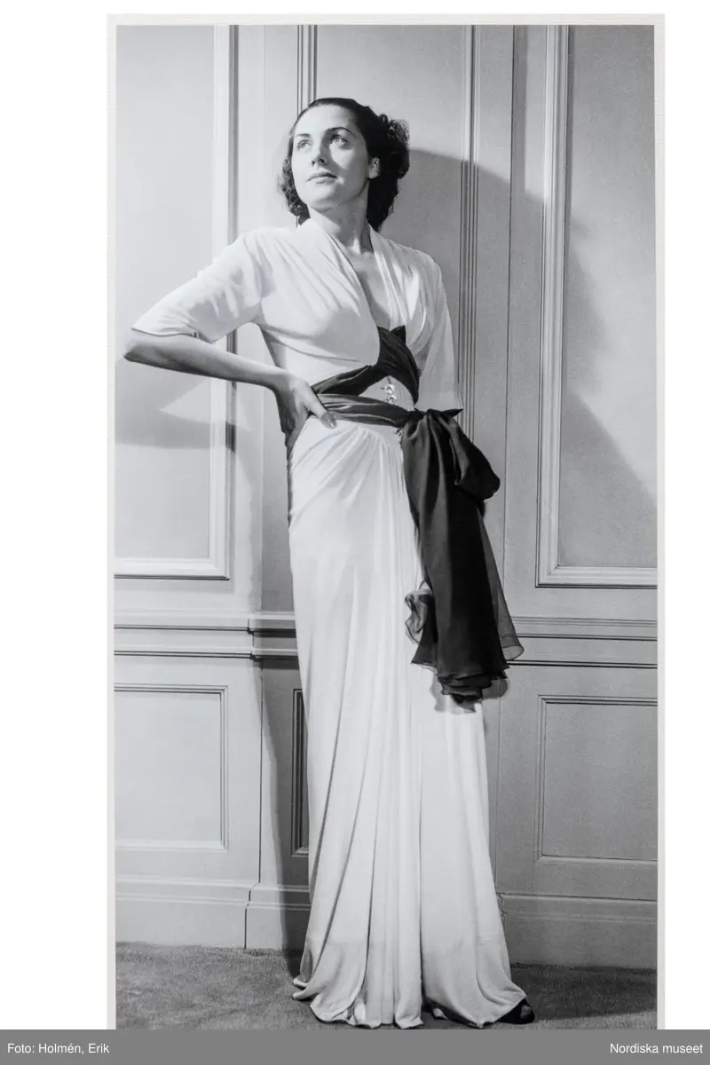 Mannekäng visar festklänning. V-ringat liv med trekvartslång ärm, knappar samt långt knytskärp i avvikande färg, transparent tyg. Från höften rynkad, hellång kjol. NK:s Franska damskrädderi, från Maison Alix.