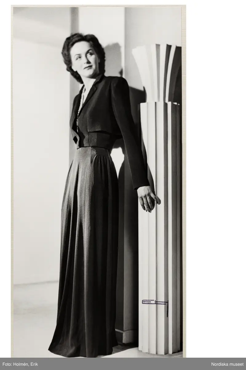 Mannekäng poserar iklädd hellång klänning med mjukt veckad kjol. Över bärs en kort jacka med slag och lång ärm. NK:s Franska damskrädderi, från Gaby Jouval.