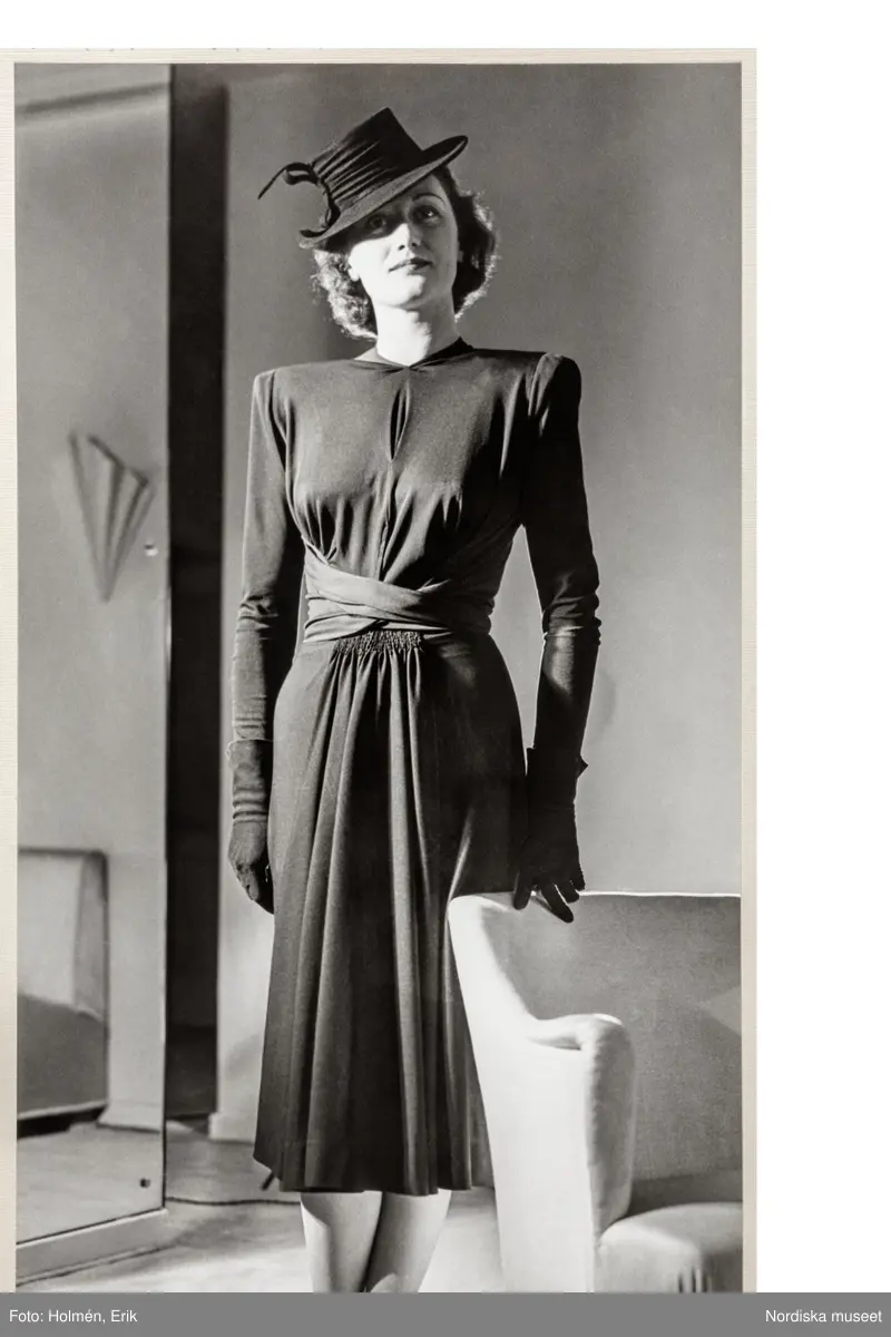 Mannekäng visar plagg i provrum. Klänning med markerade axlar, lång smal ärm och rynkning på livet, midjan markeras av omlottlagt tyg, knälång kjol med rynkat framparti. Hatt och handskar. NK:s Franska damskrädderi.
