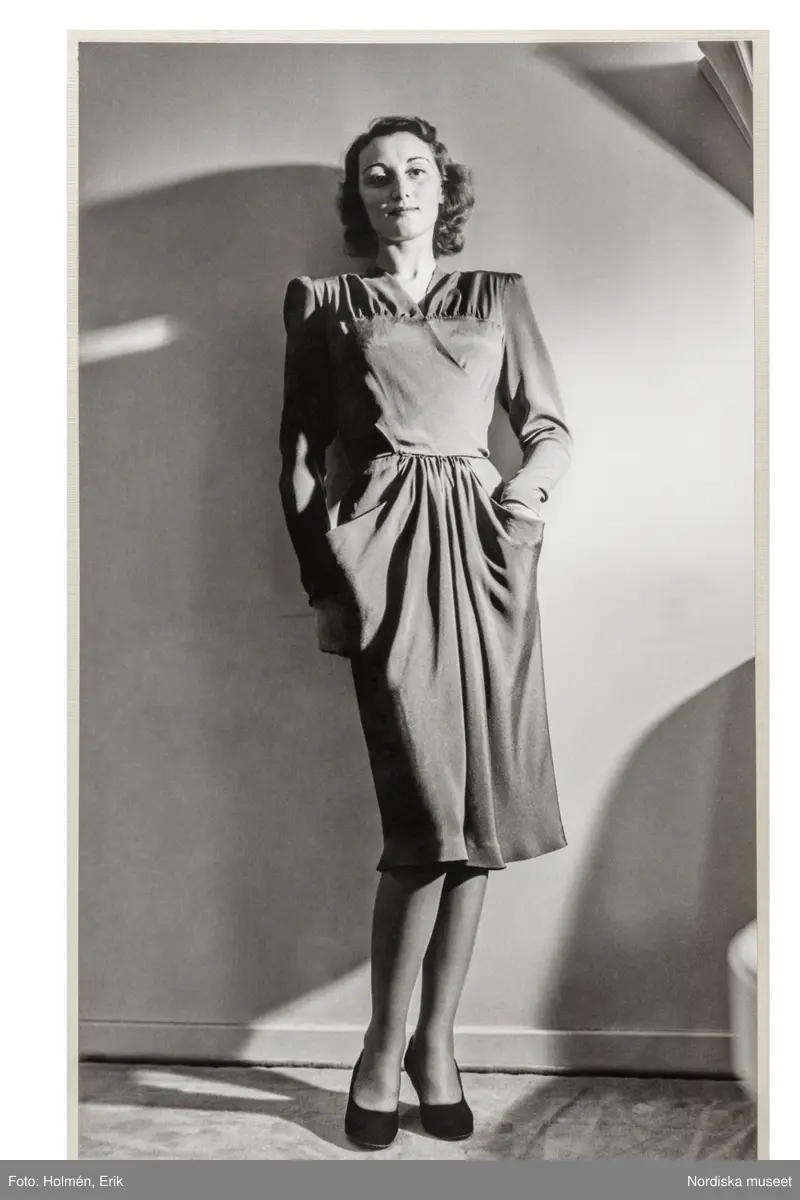 Mannekäng visar plagg i provrum. Klänning med omlottskuret liv, rynkat axelparti och markerade axlar. Lång, smal ärm. Knälång kjol, rynkad från midjan med stora fickor. Pumps. NK:s Franska damskrädderi, från Gaby Jouval.