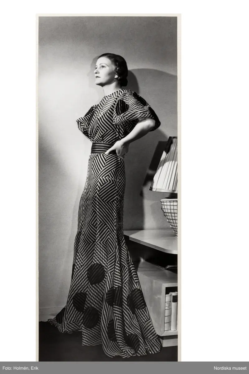 Mannekäng visar hellång klänning. Kort, vid ärm, brett skärp, kjol sydd på skrådd. Mönstrat tyg. NK:s Franska damskrädderi, från Mainbocher.