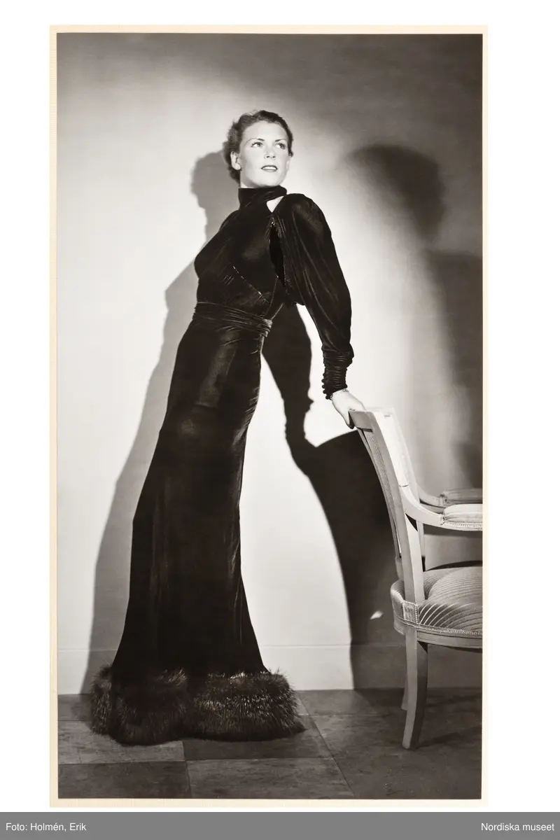 Mannekäng visar festklänning. Figurnära klänning med hög hals och utsparning vid axlarna samt lång ärm. Hellång kjol kantad med päls. NK:s Franska damskrädderi, från Jodelle.