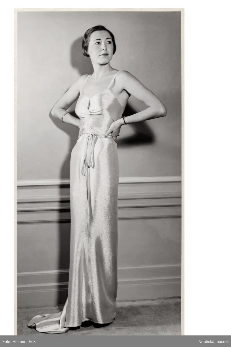 Mannekäng visar festklänning. Urringad med tunna axelband och figurnära silhuett och liv med rynkat framparti. Tunt knytskärp i midjan. Lång, rak kjol med litet släp. NK:s Franska damskrädderi.