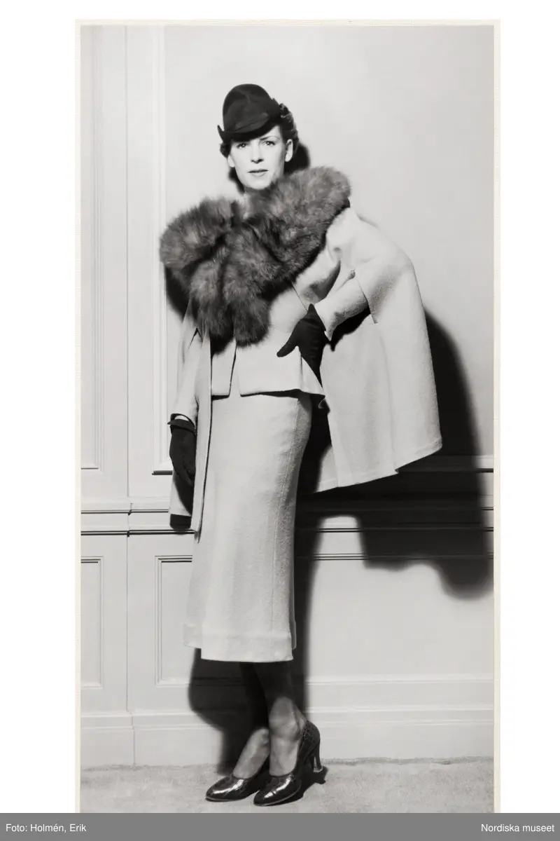 Mannekäng visar höst- och vinterkreation. Dräkt med höftlång, figursydd jacka och vadlång, snäv kjol. Över den bär hon en cape och pälsboa runt halsen. Liten hatt, handskar och pumps. NK:s Franska damskrädderi.