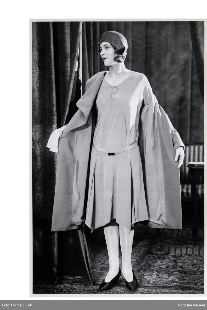 Mannekäng poserar i provrummet. Klänning med flikig, knälång kjol och låg midja markerad med skärp. Öppen kappa, liten hatt och satinpumps. NK:s Franska damskrädderi.
