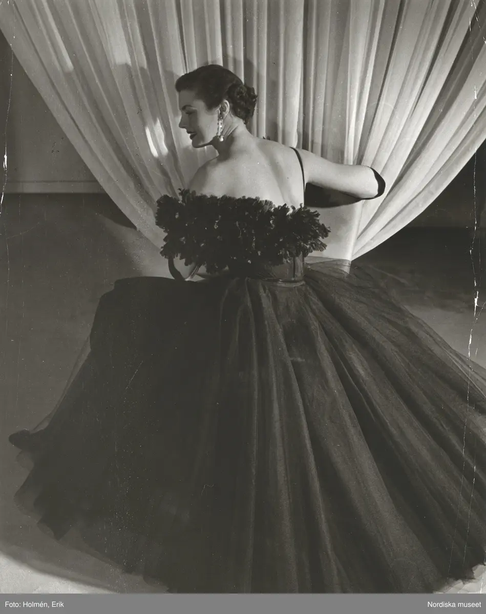 NK:s Franska damskrädderi. Kvinna i aftonklänning av mörk tyll. Kring ringningen arr arrangemang med fjädrar. Text på baksidan: "M. Rouff Våren -50"