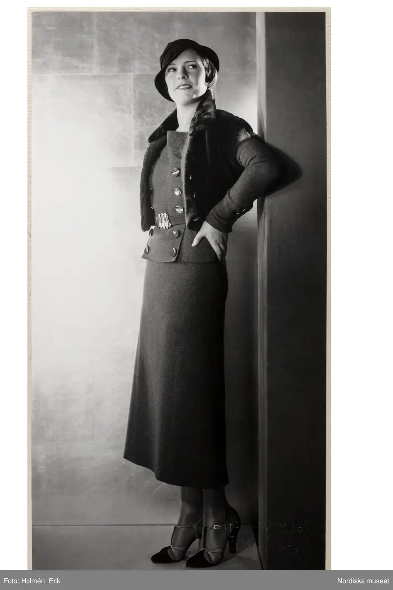 Mannekäng visar mode. Dräkt med figurnära, dubbelknäppt jacka med pälskrage och skärp samt ankellång, rak kjol. Liten hatt och högklackade skor med slejf. NK:s Franska damskrädderi.