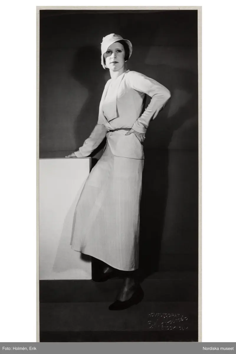 Mannekäng visar mode. Dräkt med jacka med stora slag och skärp samt ankellång, svagt utställd kjol. Liten hatt och pumps. NK:s Franska damskrädderi, från Augustabernard.