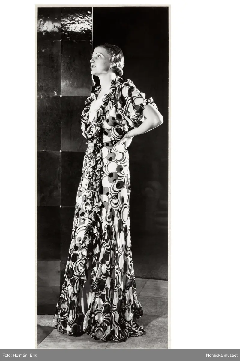 Mannekäng visar hellång klänning. Kort ärm, volang runt urringningen och framtill på kjolen. Mönstrat tyg. NK:s Franska damskrädderi, från Jeanne Lanvin.