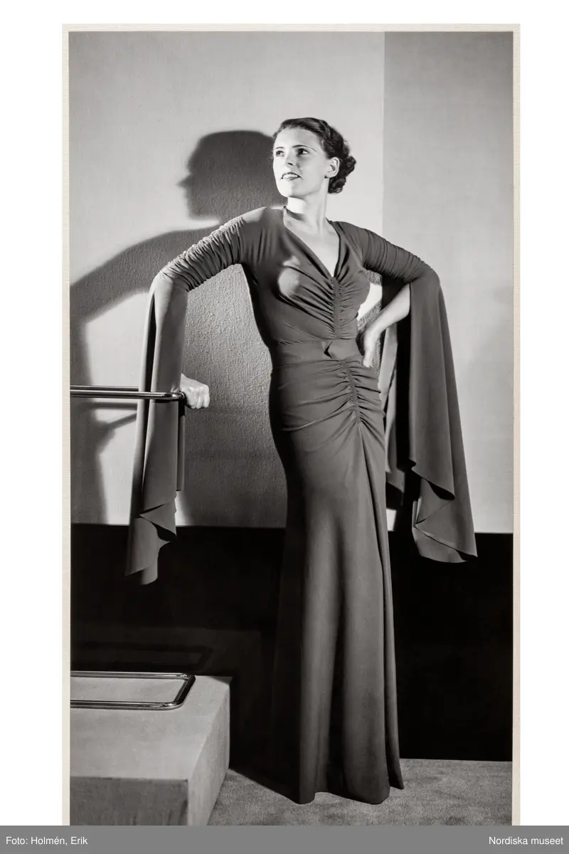 Mannekäng visar tegelröd festklänning av crêpe. V-ringad med figurnära silhuett och rynkat framparti. Lång ärm, åtsittande, med rynkad överarm, från armbågen öppen med vida hängande tygsjok - madonnaärm. Lång kjol. NK:s Franska damskrädderi hösten 1935, från Mainbocher.