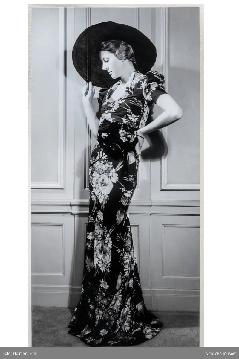 Mannekäng visar festklänning. Hjärtformad urringning, kort puffärm, liv och höftparti med figurnära skärning, hellång kjol, från låret vidare. Storblommigt tyg. Bredbrättad hatt. NK:s Franska damskrädderi våren 1938, original från Francevramant.