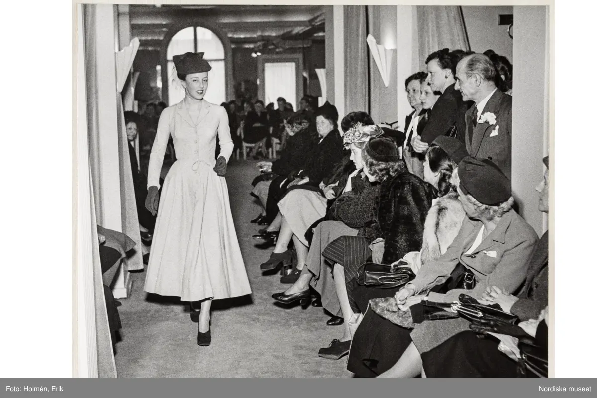 Modevisning på NK:s Franska damskrädderi. Mannekäng visar kappklänning av skjortblusmodell med vadlång kjol från Edward Molyneux. Kurt Jacobsson utser den till examensmodell i ett nyinstiftat gesällprov för sömmerskor. På stolar utmed väggarna sitter presumtiva kunder, de flesta medelålders kvinnor. Modevisningarna på NK:s Franska utgjorde säsongens höjdpunkt. Pressen bjöds in till en förhandsvisning, sedan var det stamkundernas tur i en av följande tre eller fyra visningar. Här våren 1948.