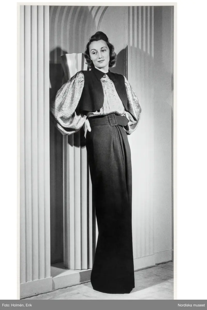 Mannekäng visar festplagg i provrum med klassicistisk dekor. Aftonklänning från NK:s Franska damskrädderis egen ateljé i guld och svart. Vid med blusande liv, långa vida ärmar med manschett. Ovanpå boeroliknande kort väst samt krage av avvikande tyg. Hellång kjol med rak silhuett, veck mitt fram. Brett tygskärp med spänne markerar midjan.