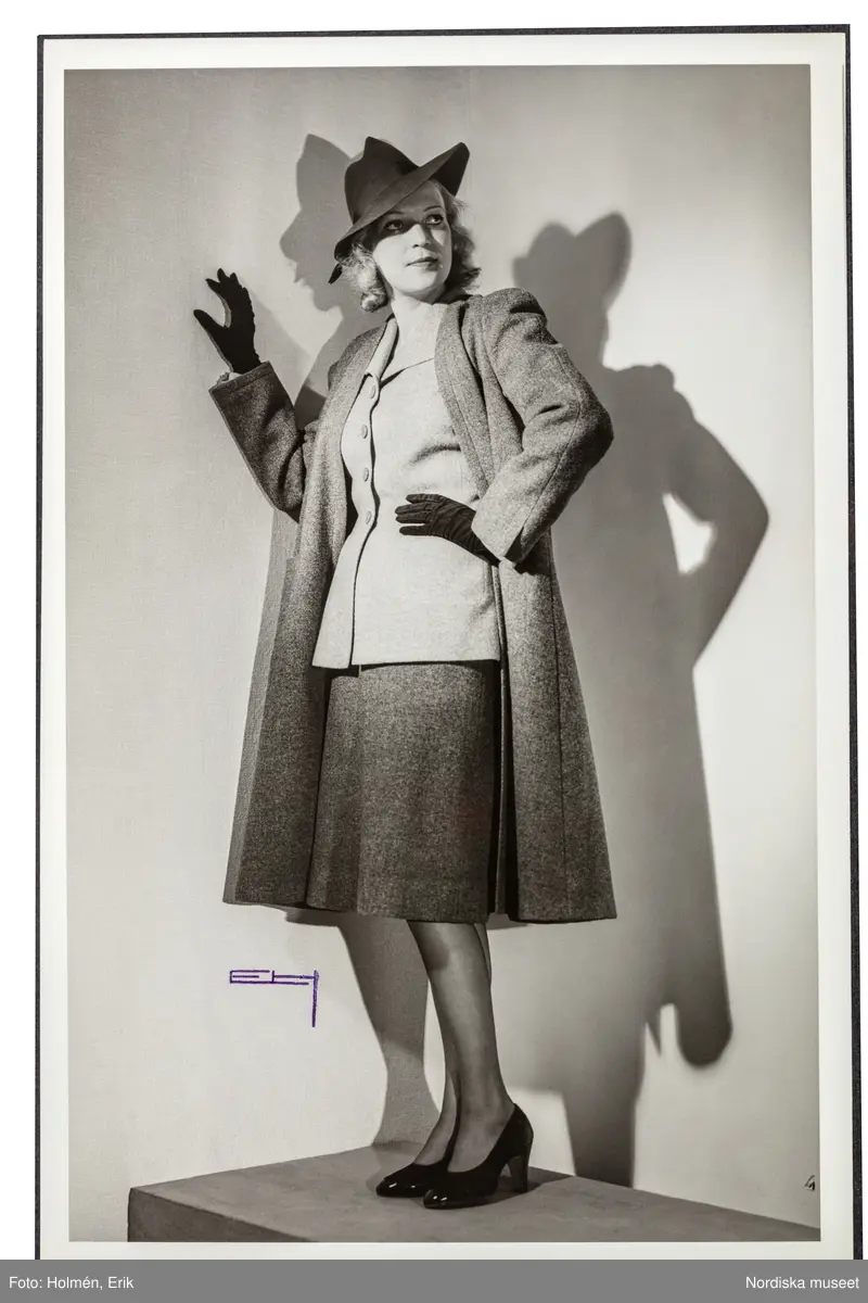 Porträtt i helfigur. Mannekäng iklädd dräkt med lång jacka och knäkort kjol samt ytterkappa. Hatt, handskar och pumps med medelhög klack. Från NK:s Franska damskrädderi.