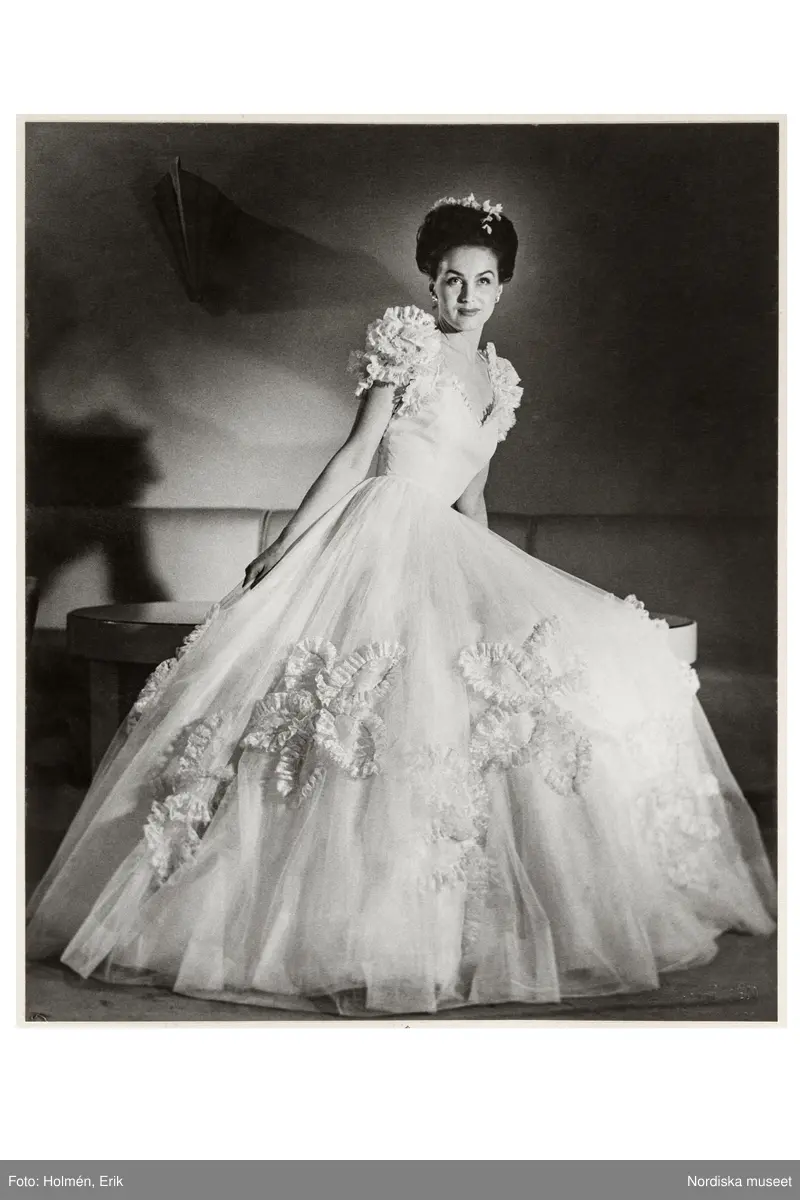 Mannekäng, Hjördis Genberg, poserar iklädd hellång festklänning med vid kjol och puffärmar. På kjolen av tyll applikationer i form av blommor. NK:s Franska damskrädderi.