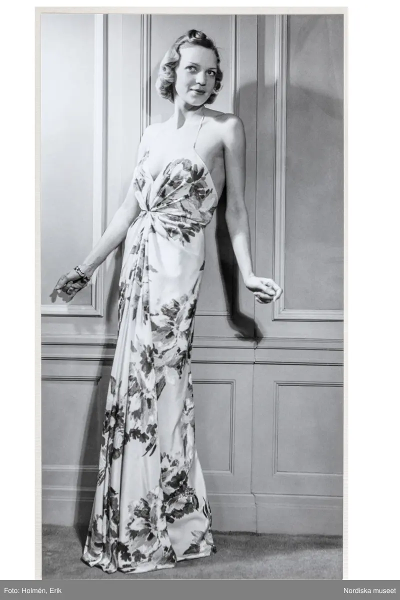 Mannekäng visar festklänning. Urringat liv med tunna axelband. Liv och kjol rynkade mot midjan. Storblommigt tyg. NK:s Franska damskrädderi, från Maison Alix.