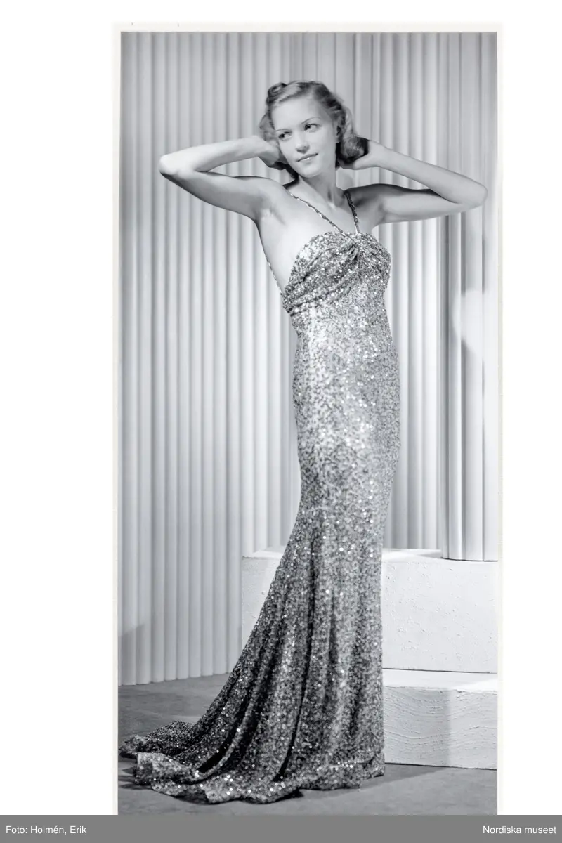 Mannekäng visar festplagg. Klänning av glittrigt tyg, liv med tunna axelband och rynkning vid bysten, hellång, åtsmitande kjol, från knäet något utställd. NK:s Franska damskrädderi.
