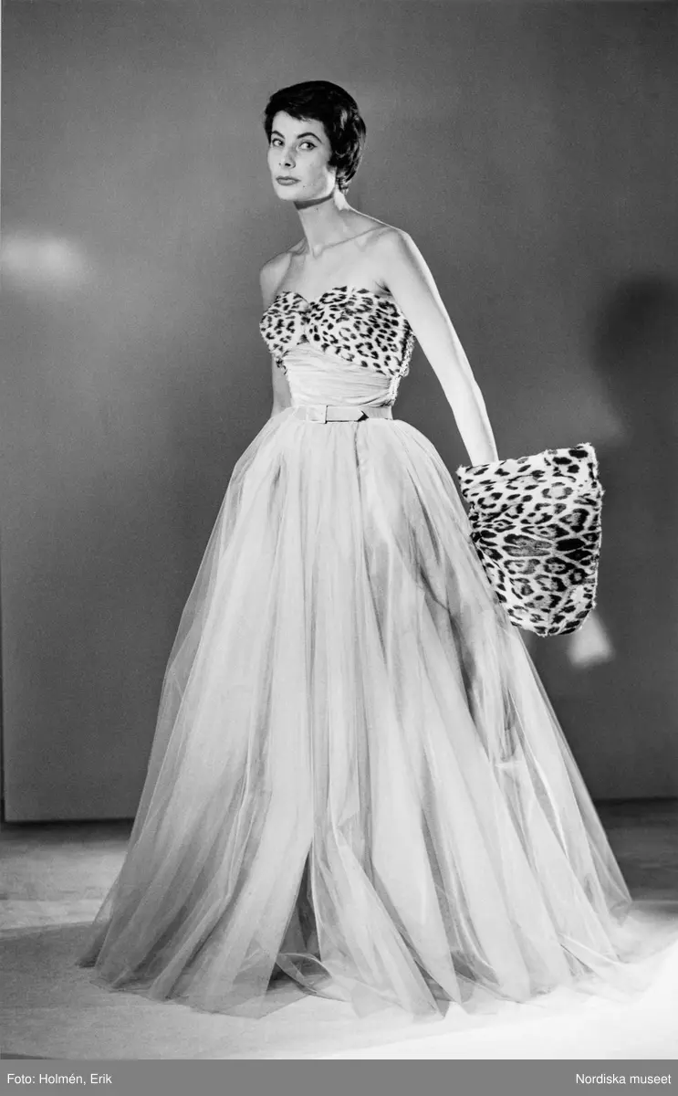 Mannekäng visar festplagg i provrummet vid NK:s Franska damskrädderi. Klänning med bara axlar, figurnära liv, skärp i midjan och lång vid kjol, yttre lager av tyll. Över bysten ett leopardmönstrat tyg, som även använts i muff. Från Pierre Balmain.