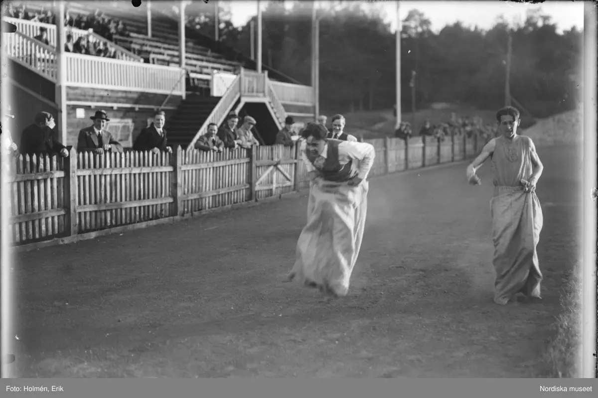 Säckkapplöpning, troligtvis i samband med fotbollsmatch