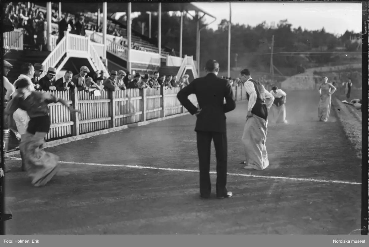 Säckkapplöpning, troligtvis i samband med fotbollsmatch