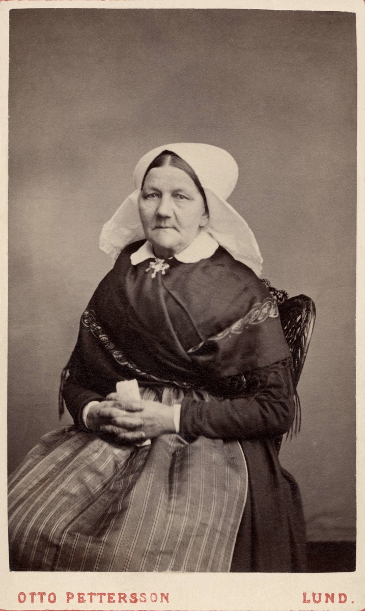 Kvinna poserar i en klänning med tillhörande förkläde och hätta