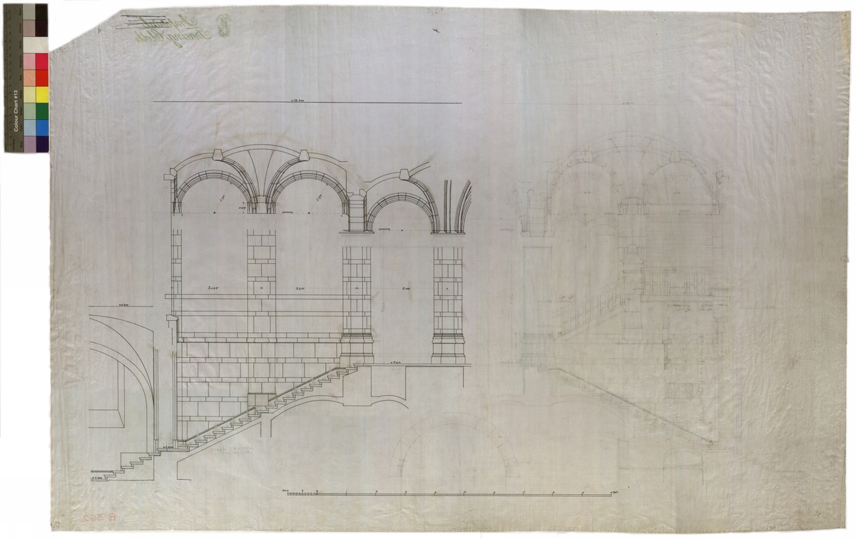 Ritning på väv över Nordiska museets huvudbyggnad. Sektionsritning, vestibulen, stora trappan. Tusch, blyerts. Linjalritning. Osignerad. Stämplad "Imperial Tracing Cloth".